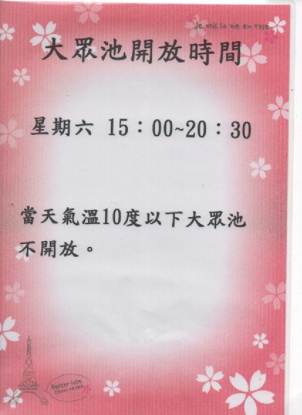 儲熱式電熱水器,已經再增加一台,冬天熱水用量大,請分散時間盥洗,如遇冷水加熱中,請至泡湯區盥洗。